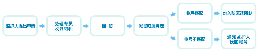 在监护人发现被监护人有沉溺的情况下,监护人可向职内公司申请发起未成年人家长监护机制。监护人需亲自通过邮寄方式 向我司提供有效材料,向职内公司提出未成年人账户监控的申请。在收到邮件后,我司即开始启动监护机制审核流程,首先进入疑似账号身份确认期。